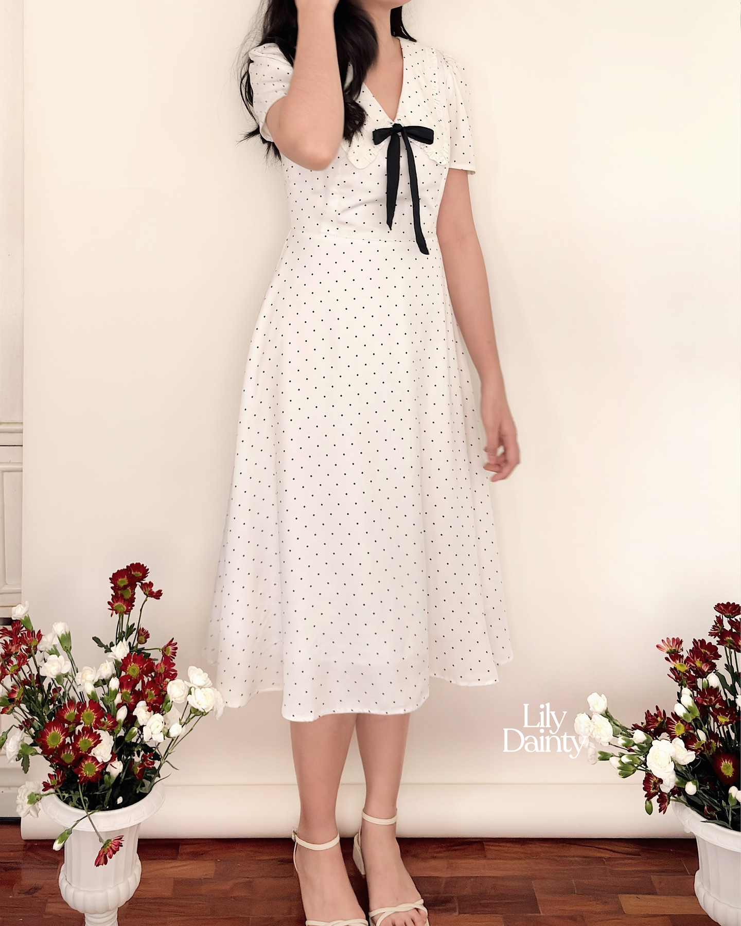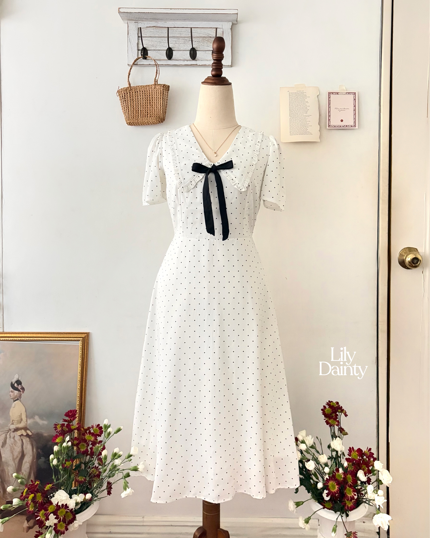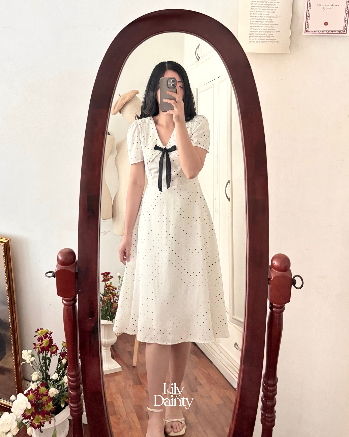 Suzie is a midi dress, made of cotton-rayon material, lined with lightweight cotton-silk blend material. Has a tie-bow at the front center neckline. It has a tie-waist and zipper at the back.