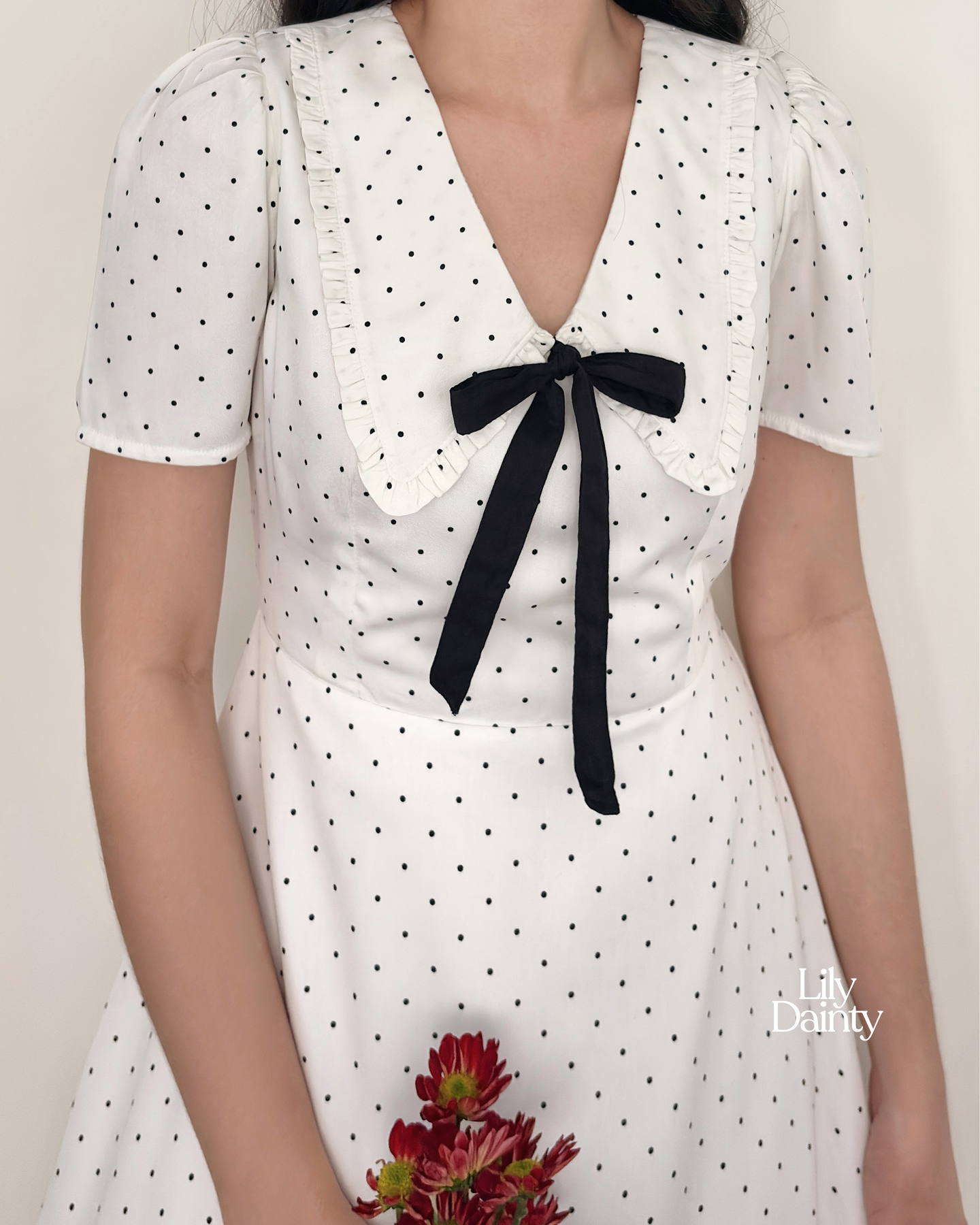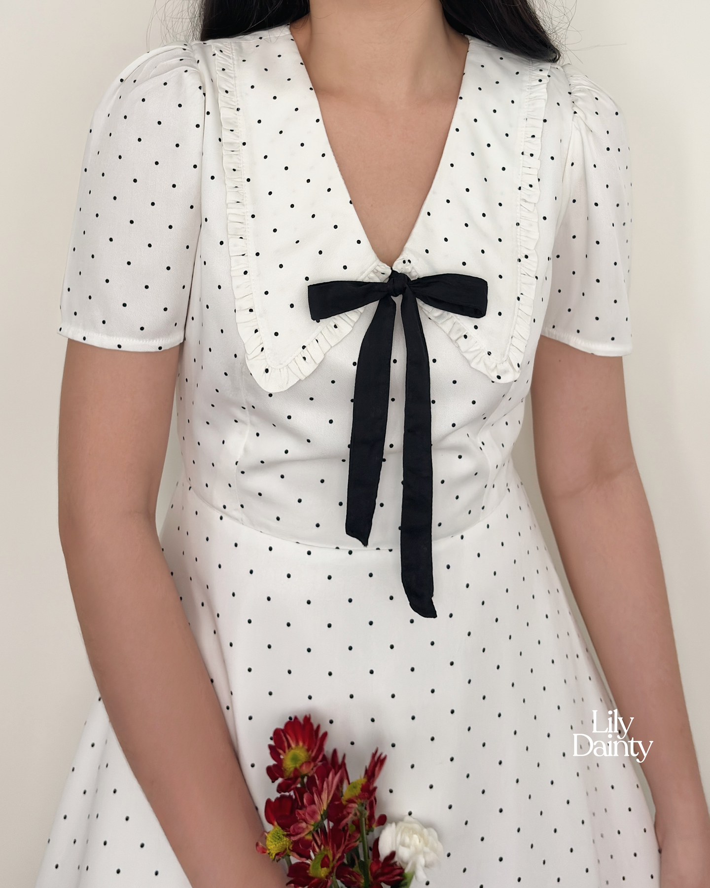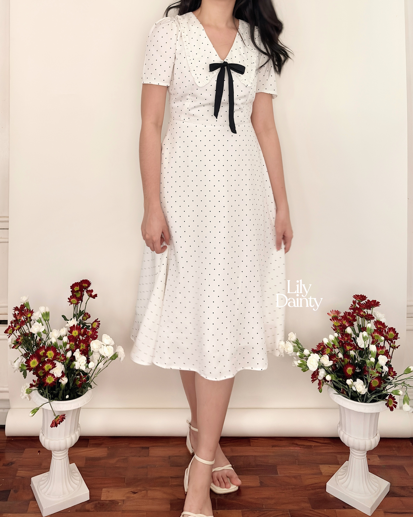Suzie is a midi dress, made of cotton-rayon material, lined with lightweight cotton-silk blend material. Has a tie-bow at the front center neckline. It has a tie-waist and zipper at the back.