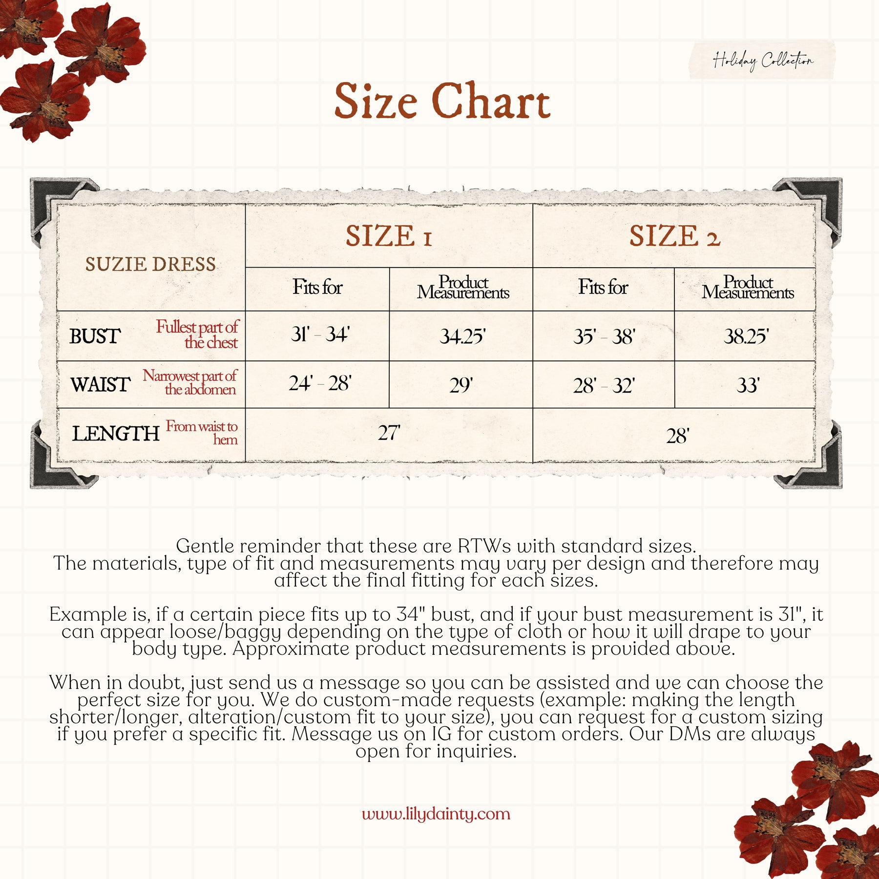 Also, gentle reminder that these are RTWs with standard sizes. The materials, type of fit and measurements may vary per design and therefore may affect the final fitting for each sizes.