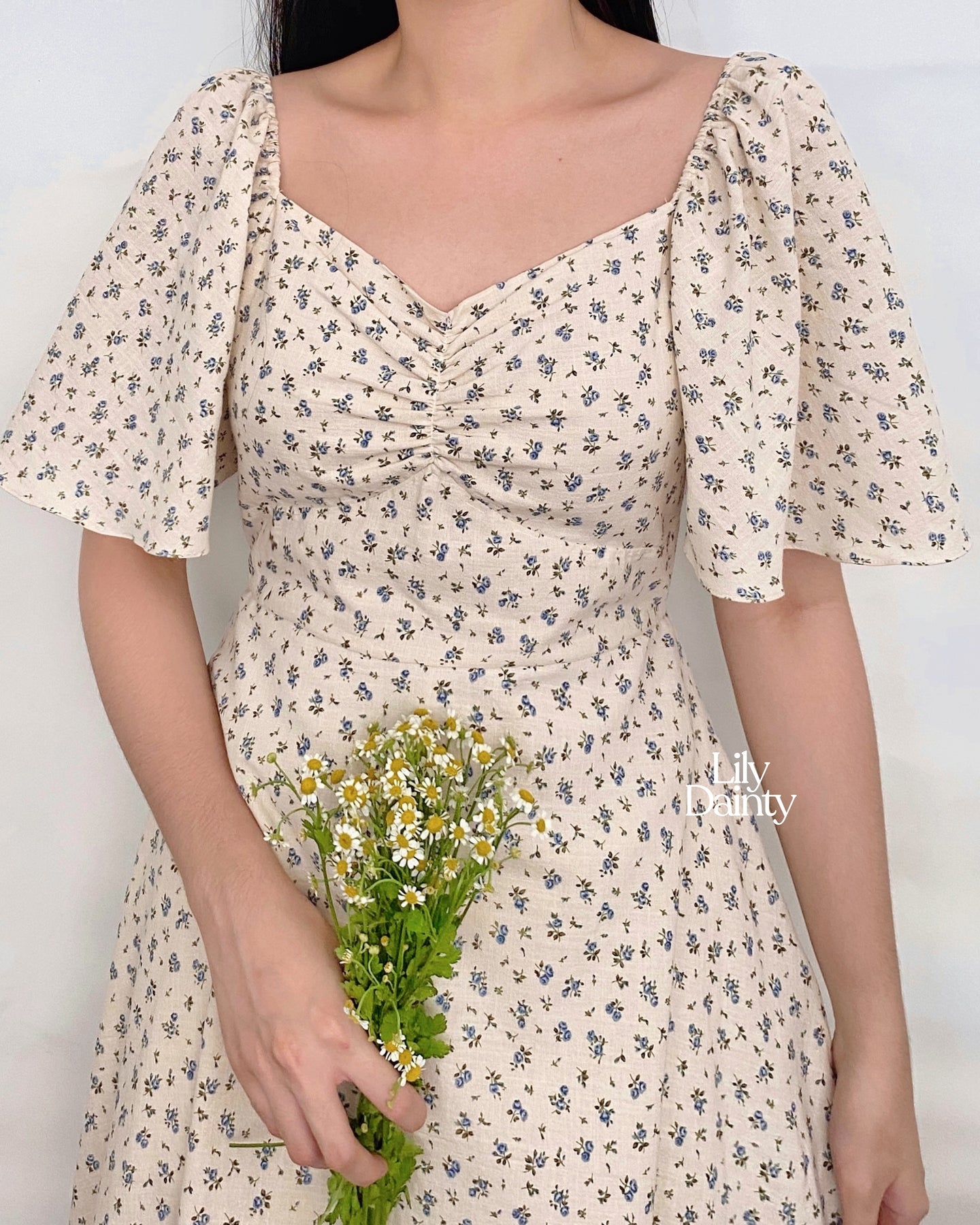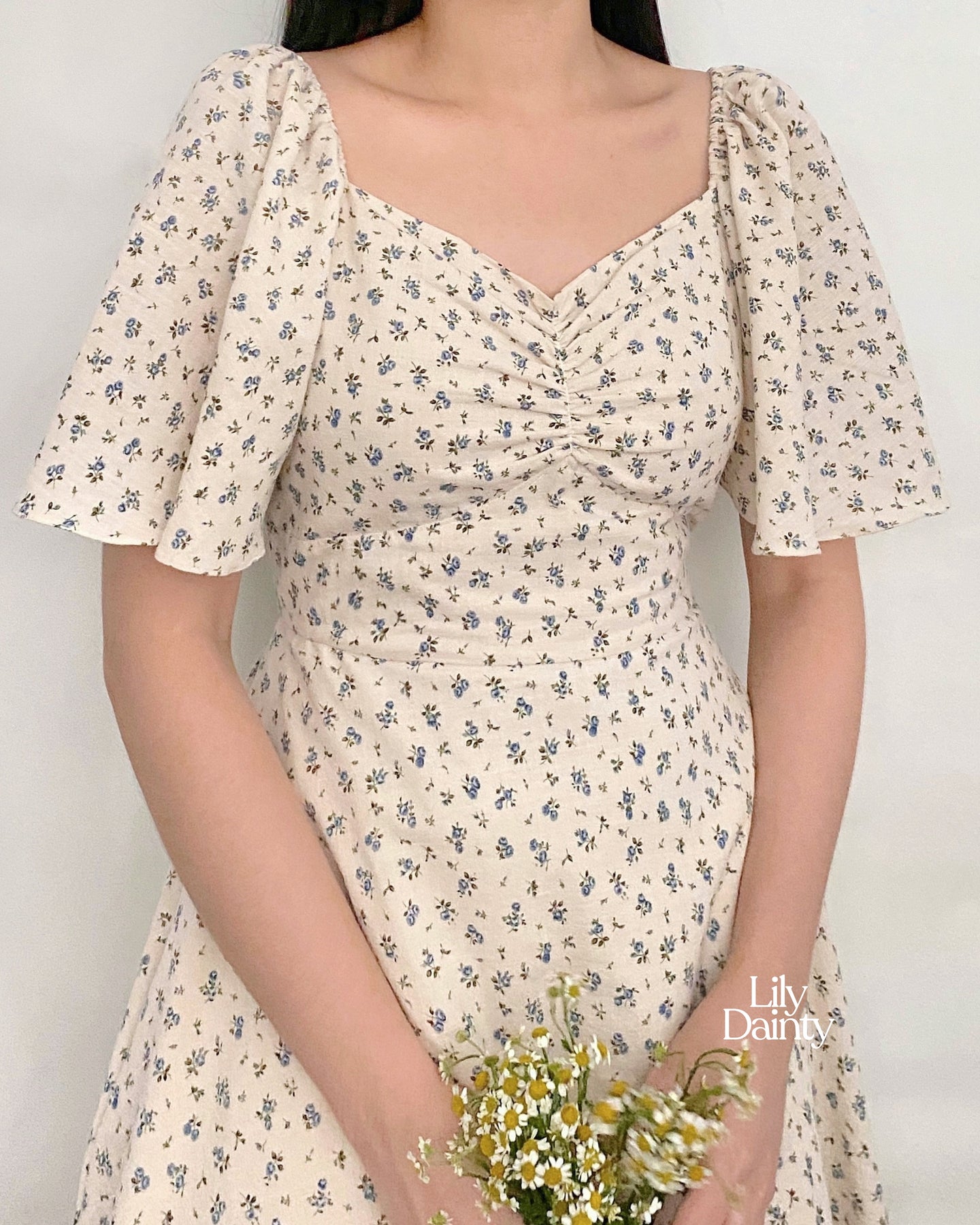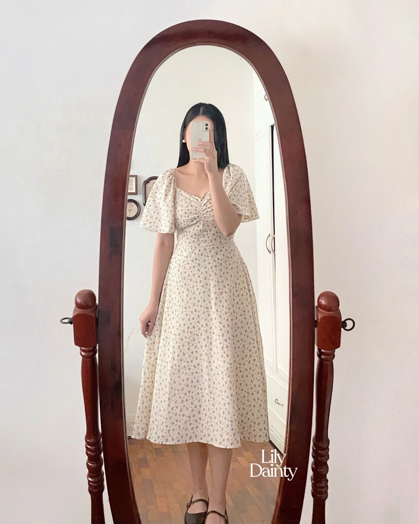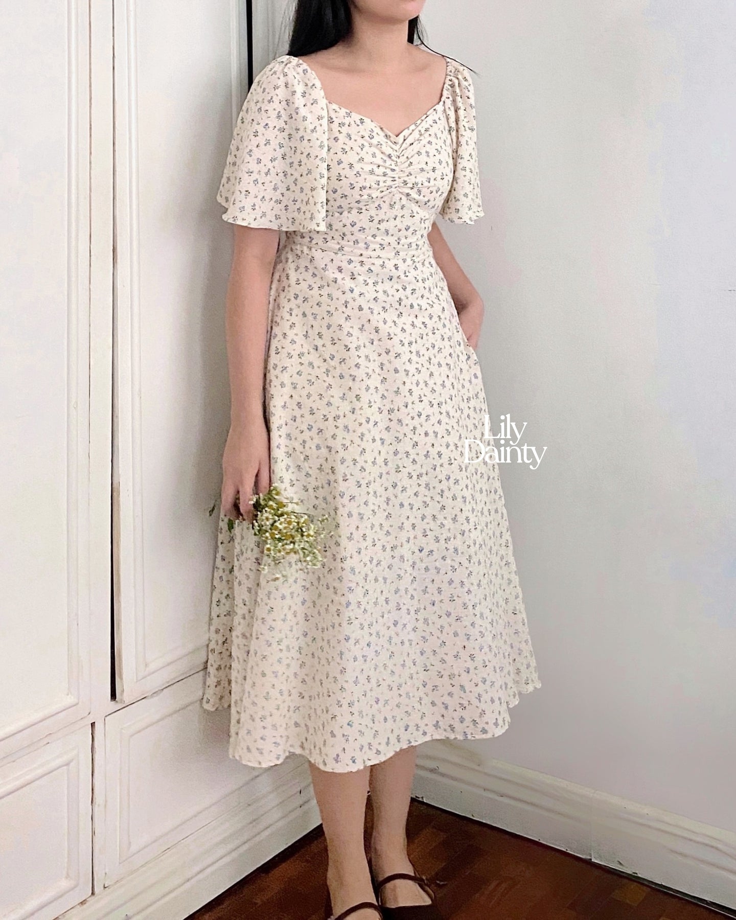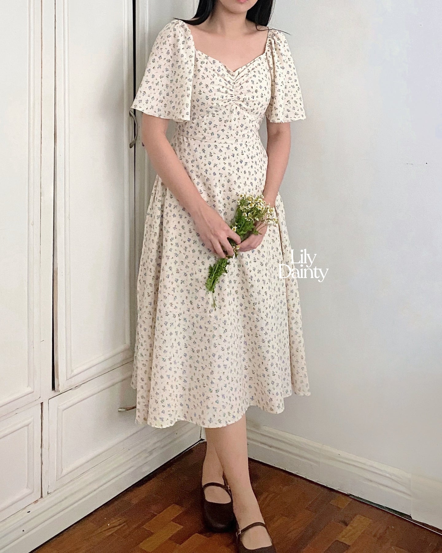 - A midi dress, with a sweetheart neckline and fluttered sleeves. -