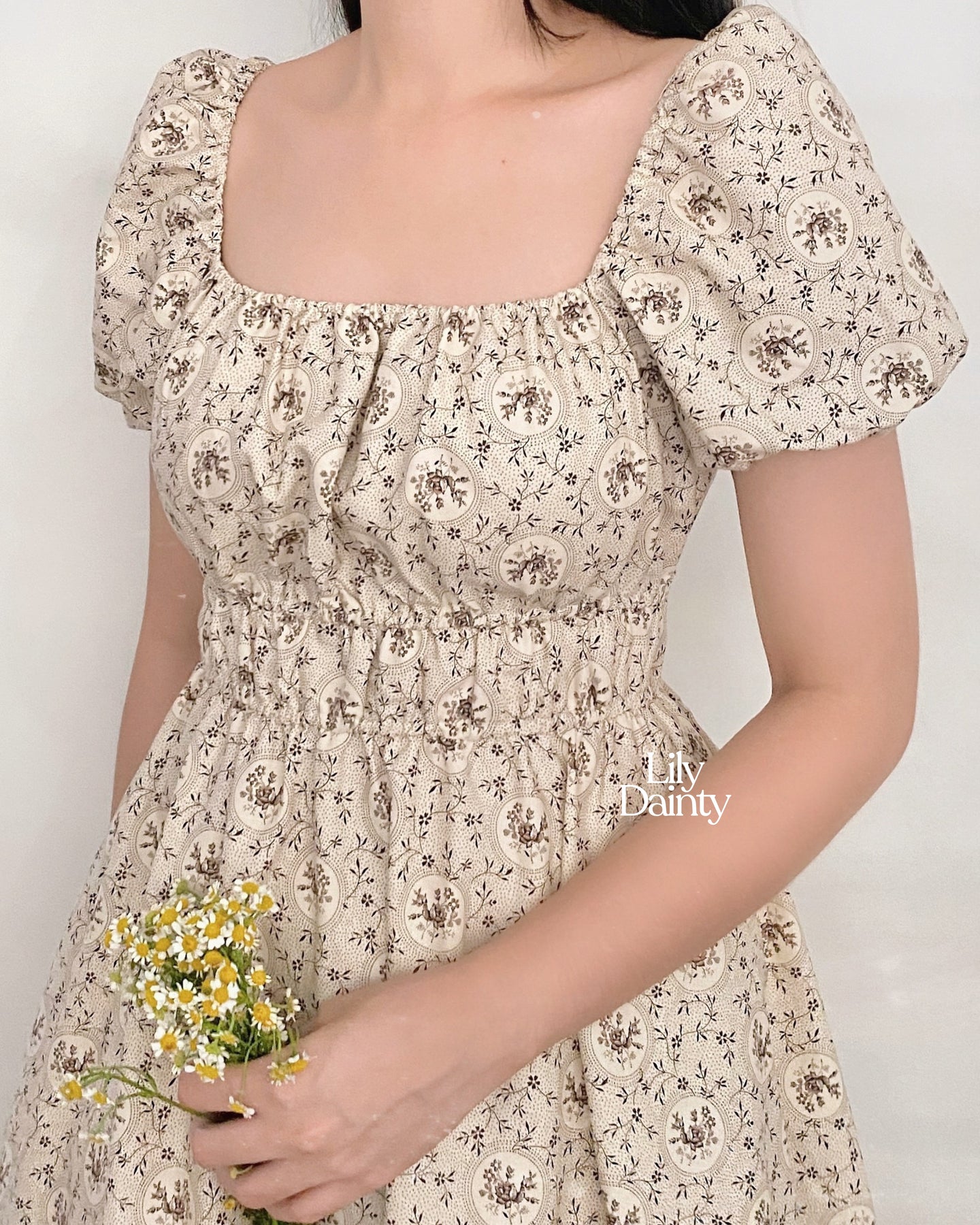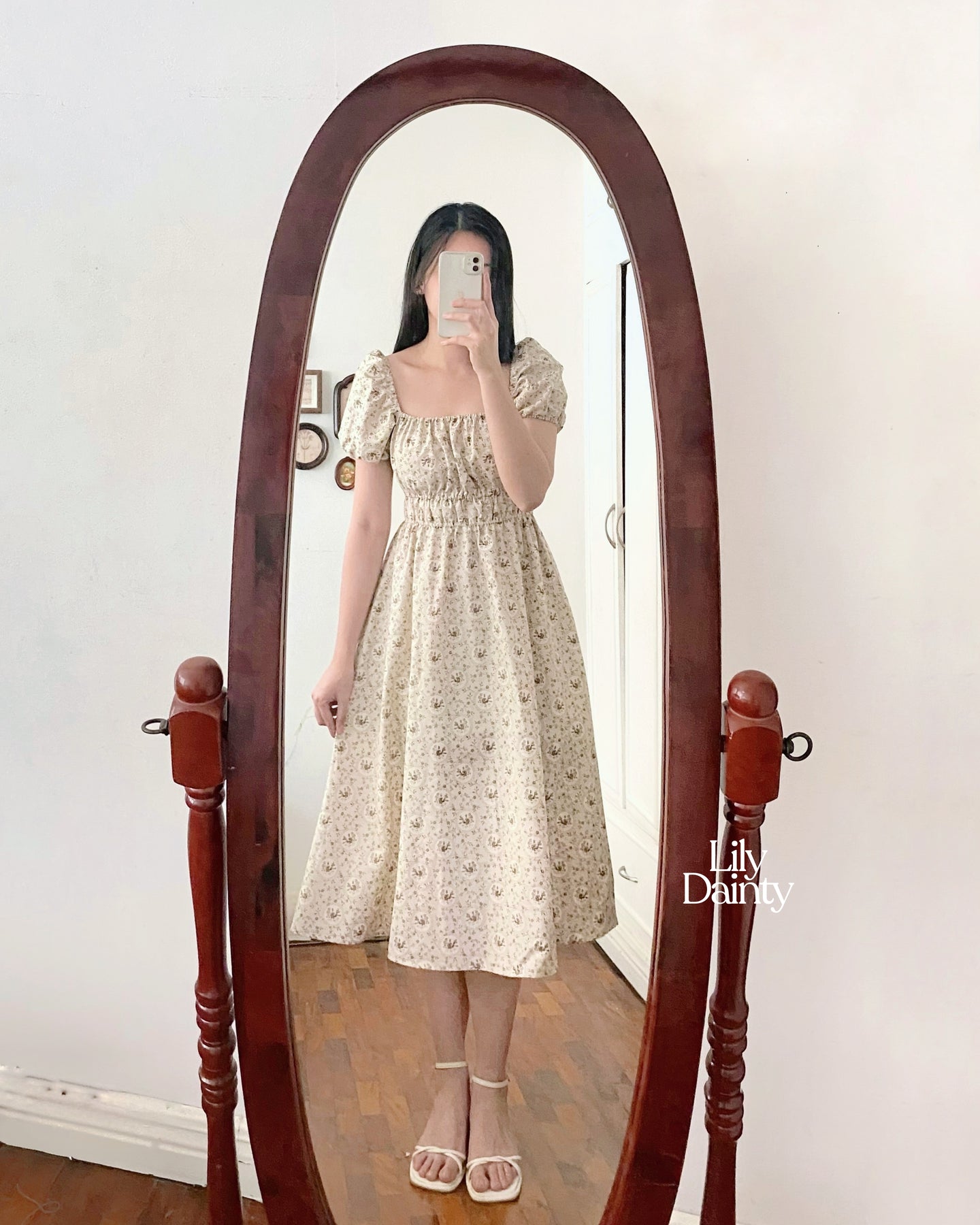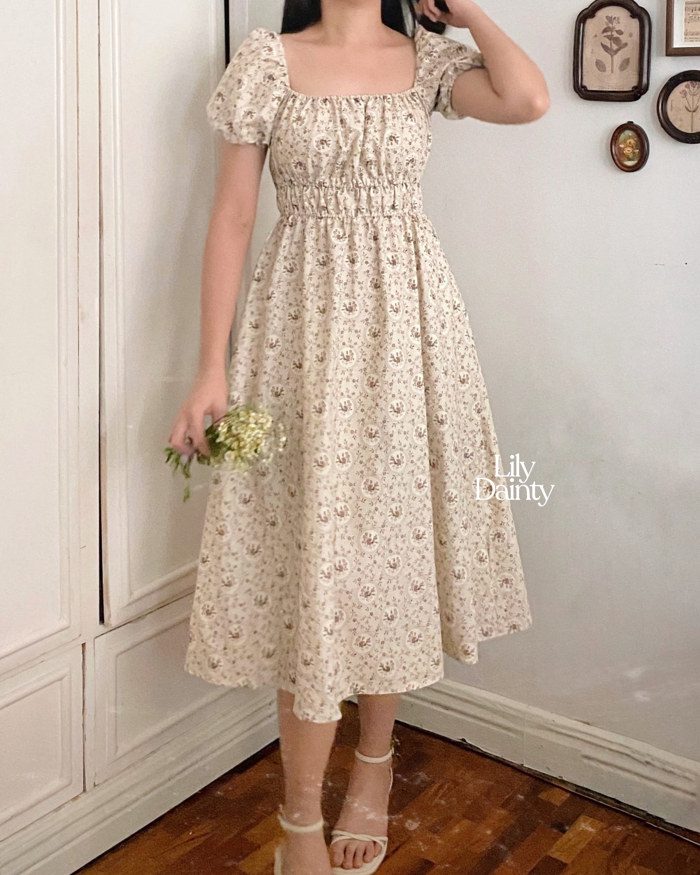 - A midi dress, with a square neckline and puffed garterized sleeves.