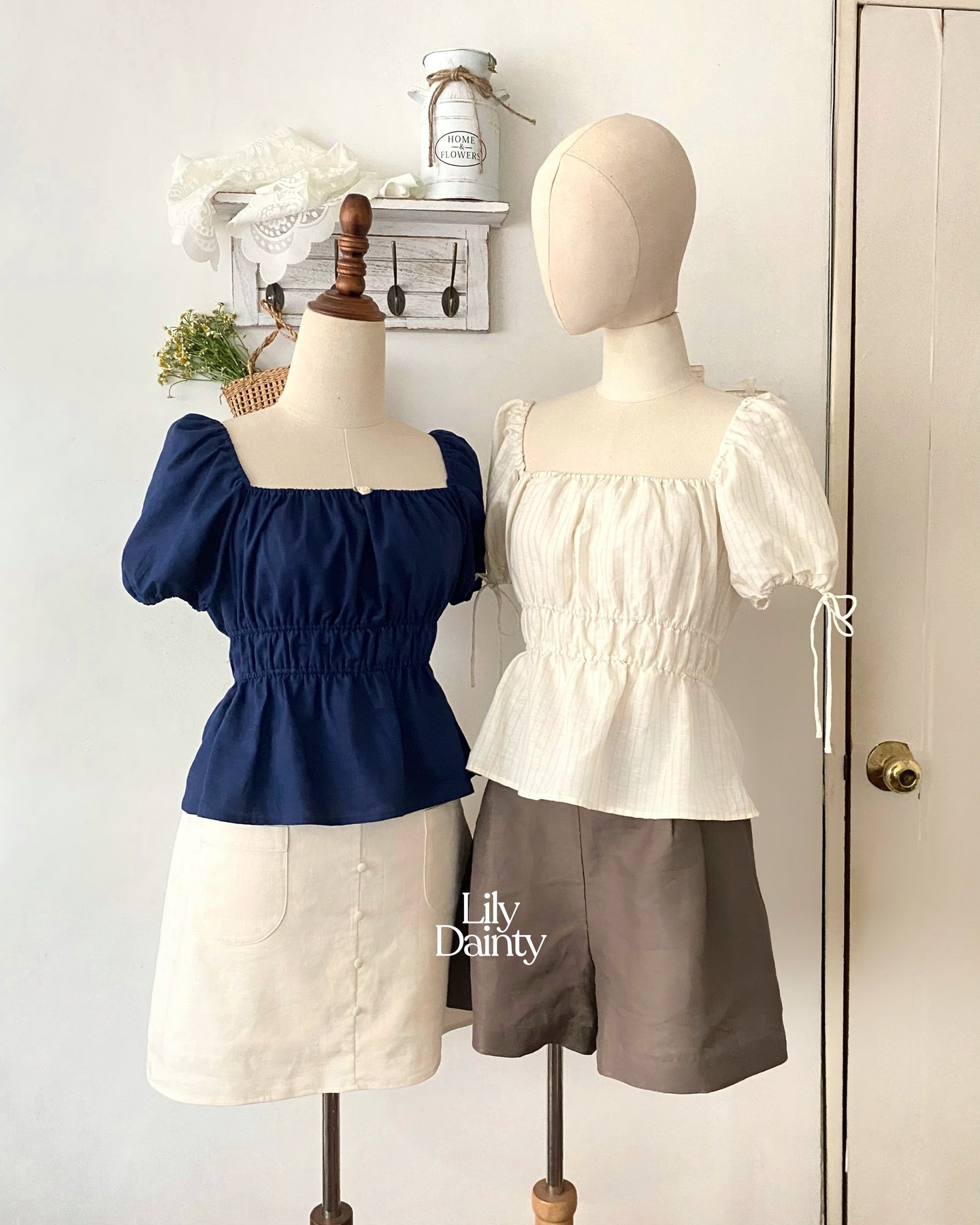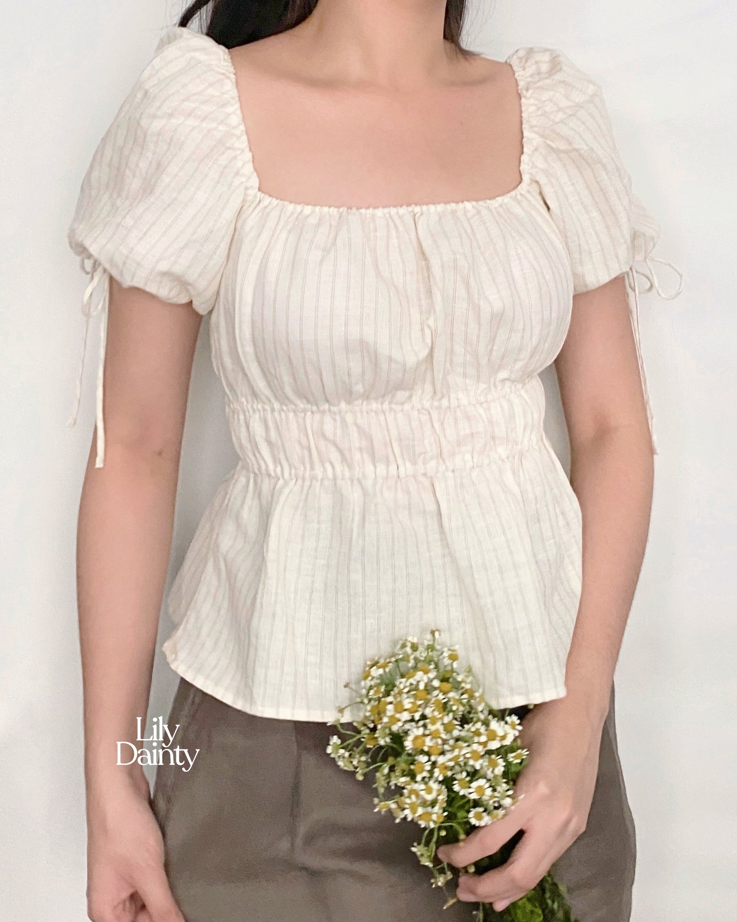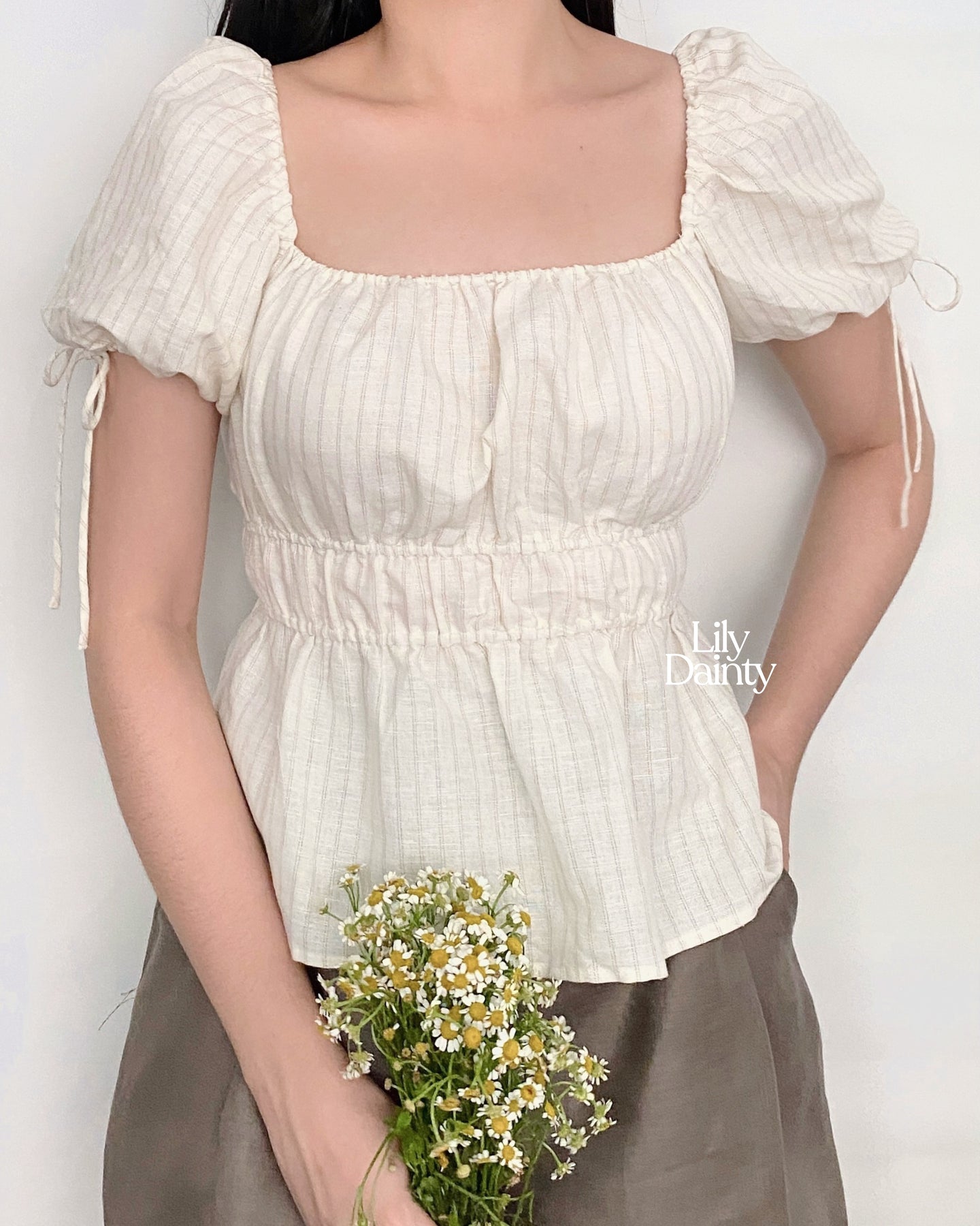 • A regular-length top, with a square neckline, puffed garterized sleeves, and a ruched bodice.