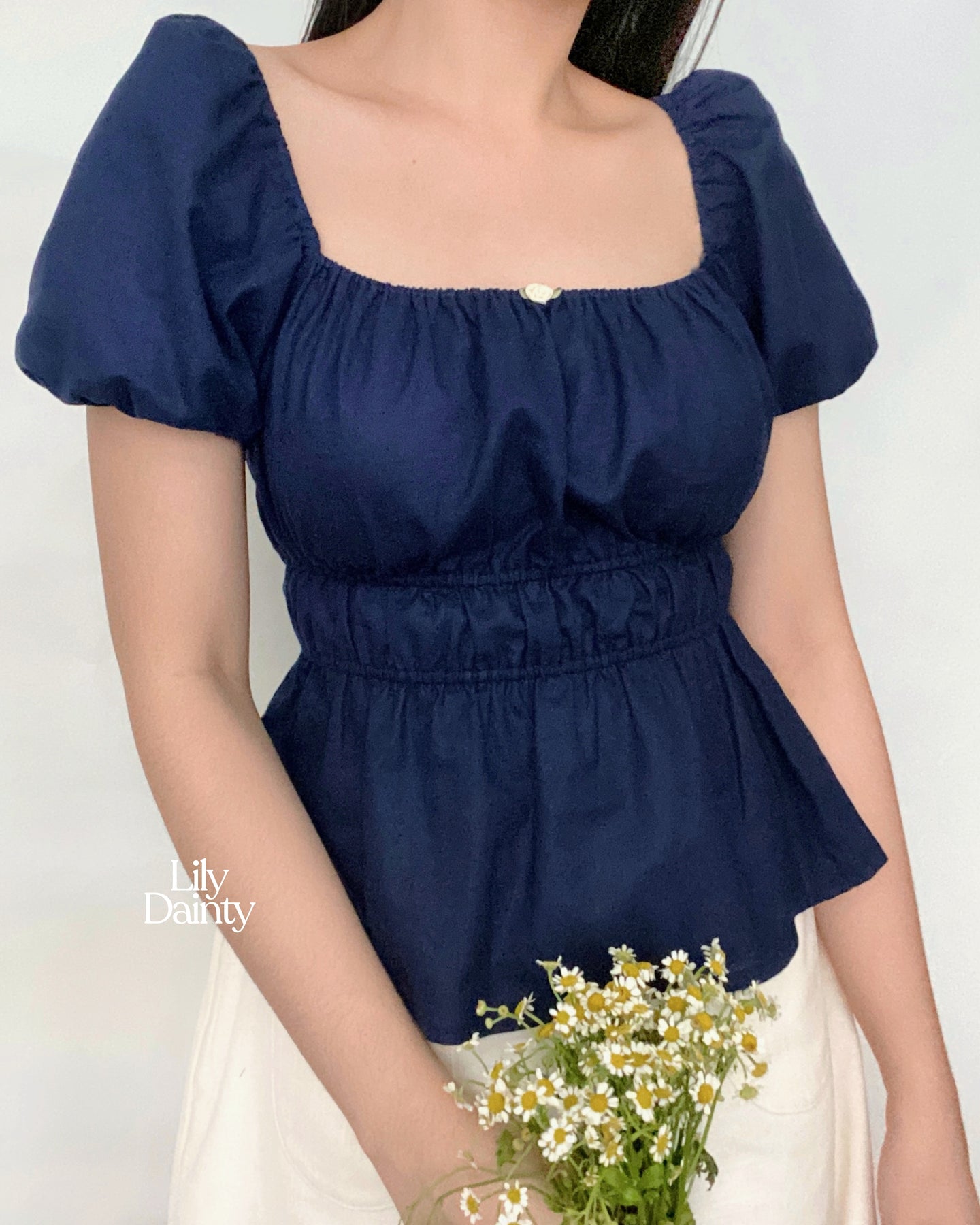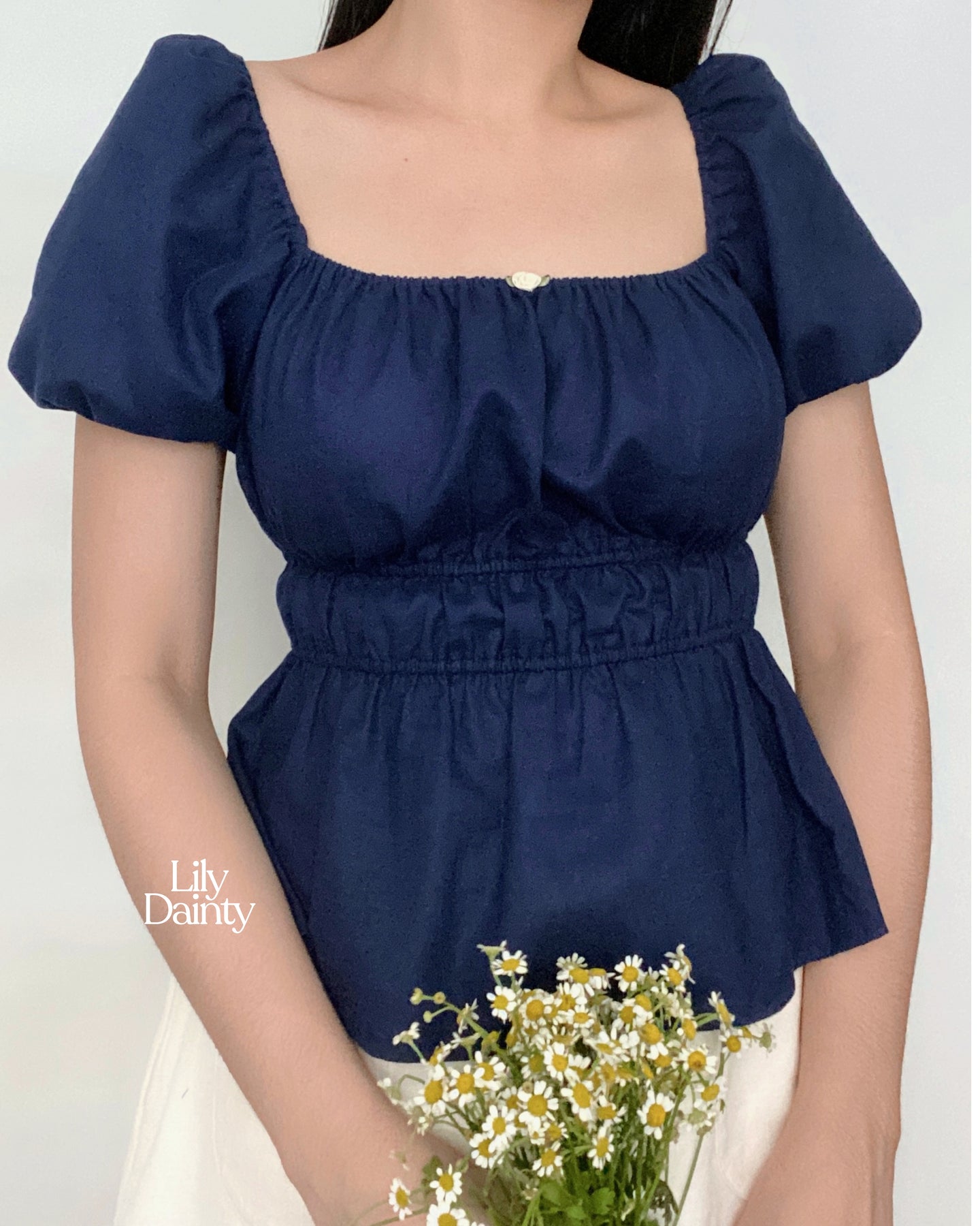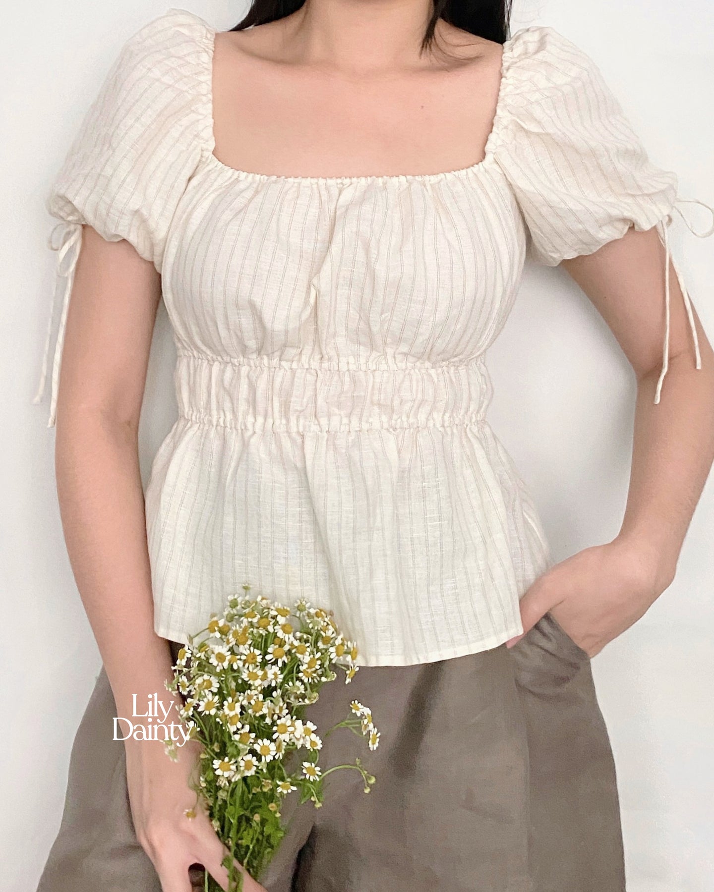 • A regular-length top, with a square neckline, puffed garterized sleeves, and a ruched bodice.