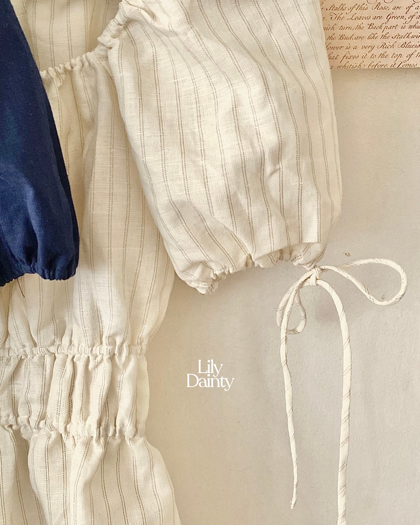 • Navy blue has an rose applique at the front center neckline. Striped variant has a tie-ribbon at the sleeves.